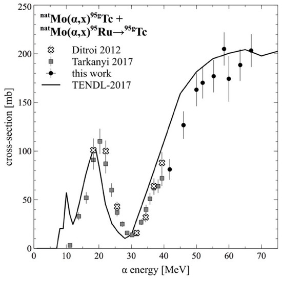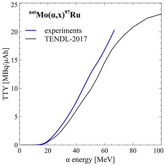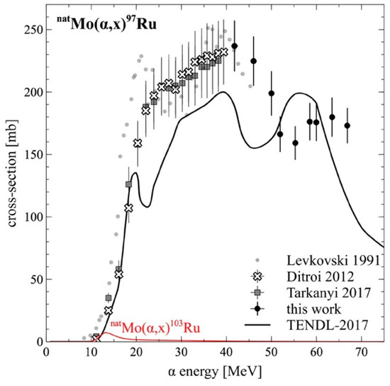 - Tárkányi, F.; Hermanne, A.; Ditrói, F.; Takács, S.; Ignatyuk, A. Investigation of activation cross section data of alpha particle induced nuclear reaction on molybdenum up to 40 MeV: Review of production routes of medically relevant 97,103Ru. Nucl. Inst. Meth. B 2017, 399, 83–100. [Google Scholar] [CrossRef]