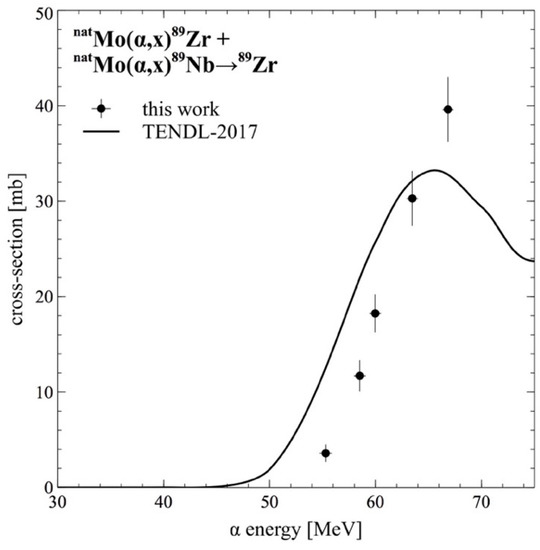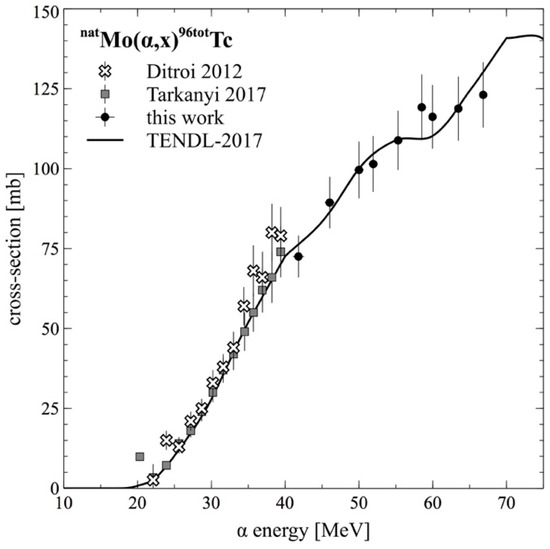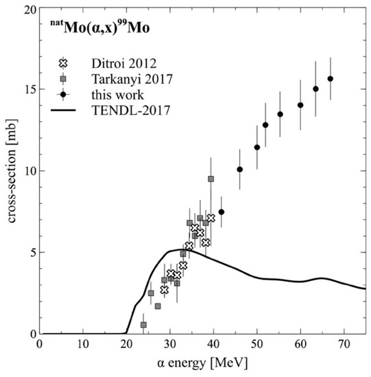 - Ditrói, F.; Hermanne, A.; Tárkányi, F.; Takács, S.; Ignatyuk, A.V. Investigation of the α-particle induced nuclear reactions on natural molybdenum. Nucl. Inst. Meth. B 2012, 285, 125–141. [Google Scholar] [CrossRef]