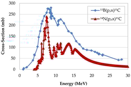 Cross-sections for 11C production from the 11B(p,n)11C and 14N(p,α)11C nuclear reactions.