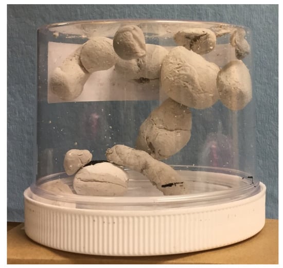 Both natural-abundance boron (19.9% 10B and 80.1% 11B) and enriched boron-11 (>98% 11B) BNNT nanomaterials are commercially available [16]. The bulk material is highly porous, allowing for diffusion of gas, and the nanotube dimensions are compatible with the recoil escape of 11C. In addition to the nanotubes, impurities of elemental boron and hexagonal boron nitride (h-BN) are present. Recovery of 11C is assumed to be strongly correlated to the impurity content, since larger structures could trap recoiling atoms and prevent recovery in the sweep gas. The BNNT material is supplied at a low density of roughly 1.38 g/cm3 [17]. It undergoes plastic deformation with light pressure and sticks to surfaces both mechanically and due to electrostatic attraction. As a result, loading a target at uniform density is challenging. A photograph of the bulk BNNT material is shown in Figure 2, and individual nanotubes and nontube impurities, such as boron and h-BN particles, can be seen in the scanning electron microscope (SEM) images shown in Figure 3.