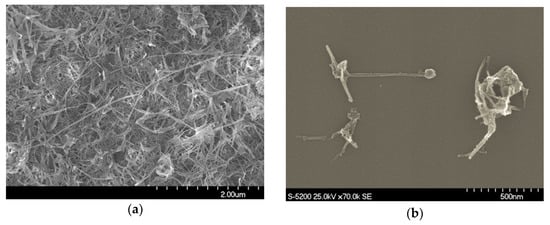 SEM images of (a) bulk BNNT material and (b) isolated nontube impurities.