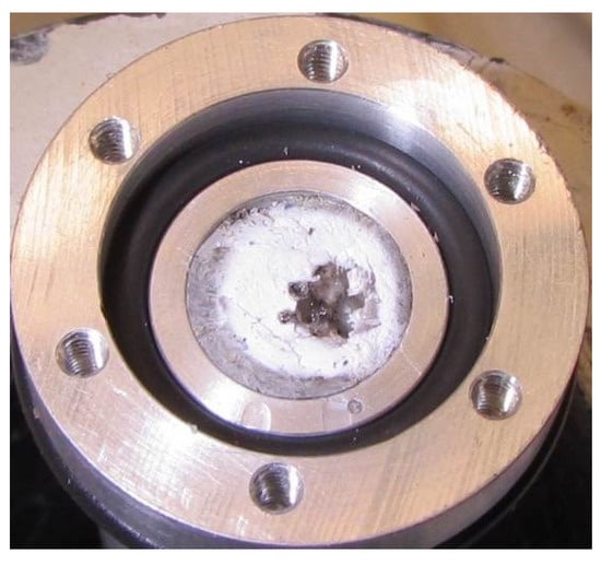 Using the initial prototype, sufficient quantities of 11C were produced and recovered using a range of operating conditions to demonstrate the feasibility of using BNNT as a target material, and more than 80% of the recovered 11C was in the desired form of CO2. The principle technical challenge was identified to be minimizing damage to the BNNT target media that occurred during target operation at a high current. Irradiation at 20 μA with 10.5-MeV incident protons resulted in a dramatic reduction in 11C saturation yield and physical damage to the BNNT material, including the formation of a cavity in the center of the target chamber with translucent glassy crystals along its margins, as shown in Figure 5. The crystalline material was presumed to be boron oxide (B2O3).