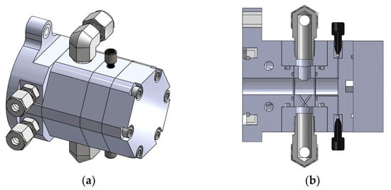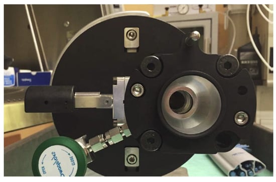 A custom BTI Targetry target station, shown in Figure 8, was used, consisting of a beam tube, a vacuum isolation valve, a collimator with an 8-mm diameter opening, and target mounting geometry. Because the BN-124 prototype target is considerably longer axially than the prior prototype or commercial 18F targets, the target–collimator interface is subjected to a greater bending moment while supporting the weight of the target. A pressed stainless steel pin on the vertical mid-plane was added to provide additional mechanical support for this application.
