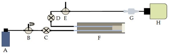 Diagram of experimental apparatus for material irradiation and isotope collection, illustrating a (A) target gas tank and regulator, (B) flow control valve, (C) target load valve, (D) target unload valve, (E) delivery/waste valve, (F) target body and target material, (G) soda lime carbon dioxide trap, and (H) radioisotope gas collection bag.