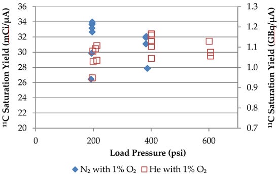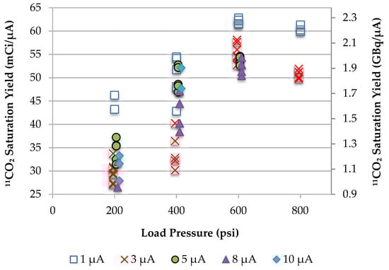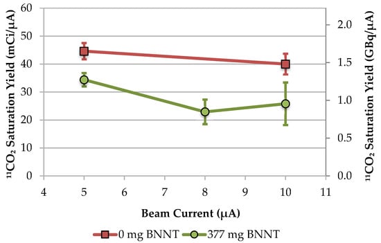 Proton beam tests were performed on the single target station using the BN-124 prototype, which had a 6.0-cm depth and a 5.7-cm3 volume, for beam currents between 1 and 10 μA, with static operation at load pressures between 200 and 800 psi using a fill gas of nitrogen with 1% oxygen. The target was loaded with 377 mg of 11BNNT, corresponding to an effective BNNT density of 0.07 g/cm3. A recovered target saturation yield of 11CO2 as a function of beam current and load pressure is shown in Figure 10. More than 95% of the recovered activity was in the desired form of 11CO2, as indicated by soda lime trapping and confirmed by GC measurements. Target saturation yield increased with pressure between 200 and 600 psi, and then began to drop off. Saturation yield was highest at 1 μA, which corresponded to the lowest target heat input.