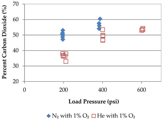 Total saturation yield of 11C in all forms (11CO2 and 11CO) for the BN-131 target irradiations is shown in Figure 12. Since helium does not offer a competing production reaction for 11C, all recovered 11C was produced in BNNT for these irradiations. The total yield of 11C was roughly equivalent for both gases, suggesting minimal production of 11C in the nitrogen fill gas. The fraction of activity recovered in the form of carbon dioxide is shown in Figure 13. Using helium fill gas in the BN-131 target consistently produced less 11C as CO2 (35%–55%) compared to using nitrogen gas in the BN-131 target (50%–55%). For both fill gases, the percentage of activity recovered as carbon dioxide was significantly less than that observed when using nitrogen gas in the BN-124 target (>95%).