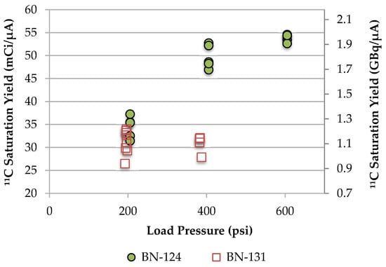 11C saturation yield for the BN-124 and BN-131 targets at 5 μA using nitrogen with 1% oxygen.