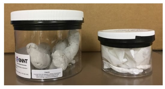 Poor recovery of produced 11C and material degradation at modest beam currents both pose significant challenges for the development of a commercial system. The trapping of produced 11C in the target was most likely a function of the nontube impurities present in the commercially sourced BNNT nanomaterials. Impurities could be removed prior to irradiation by thermal oxidation in a furnace, followed by a water rinse. Future work will include beam irradiation tests of a sample of 11BNNT that has been purified at 600 °C for 1 h at the National Institute of Aerospace (NIA). 11BNNT material as-received from the BNNT, LLC, supplier is shown next to the purified material (which is layered with wax paper) in Figure 18. The purified material is whiter in color, more brittle, and has increased density of roughly one order of magnitude.