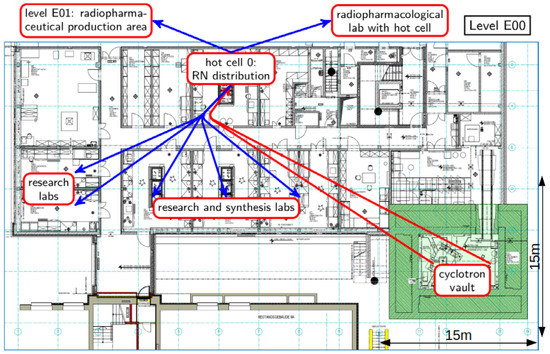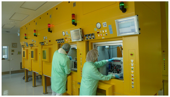 As is well known, a number of prerequisites or work steps must be fulfilled for the production of a radiopharmaceutical: The radiolabelling reaction, i.e., the “introduction” of the PET radionuclide into the biomolecule, is performed by synthesis modules in lead-shielded hot cells to minimize the radiation exposure to the staff. All production steps have to be performed under clean room conditions and according to GMP guidelines. For that purpose a clean room area of about 200 m2 was established within the ZRT. It is equipped with 14 hot cells under clean room conditions B and C (see Figure 2).