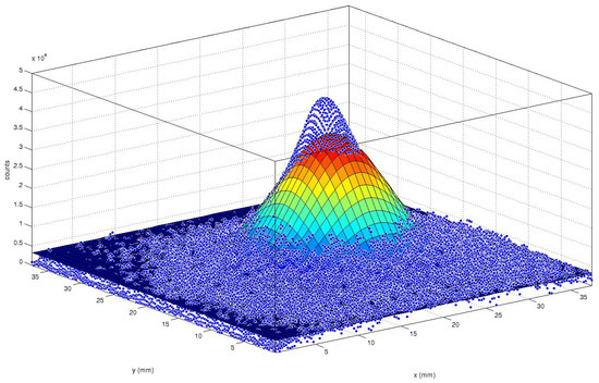 A two dimensional gaussian function was fitted to the measured profile to determine the beam size in x- and y- direction.