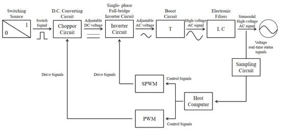 A sinusoidal high-voltage AC power (0~4 kV, 0~2 kHz) is designed, as shown in Figure 2, to meet the demand of AC EDW technology. The voltage of the DC converting circuit serves as the input voltage of the single-phase full-bridge inverter circuit when the switching source sends a signal. Compared with the DC regulated power for the full-bridge inverter circuit, the DC converting circuit can effectively suppress the leakage inductance and the harmonic distortion factors. Thus, the DC converting circuit can be used to achieve the adjustable output voltage and to reduce the total harmonic distortion (THD). The voltage of the DC converting circuit will be the input voltage of a single-phase full-bridge inverter circuit, then the controllable AC voltage is output under the control of pulse width modulation (PWM). After that, the AC signal is boost-filtered to output a sinusoidal high-voltage AC signal. Aiming at the AC power source with low power for EDW, the PWM and sinusoidal pulse width modulation (SPWM) control modes are adopted to achieve a controllable sinusoidal alternating voltage. The sampling circuit monitors the voltage waveform in real-time and the control signals can be sent to SPWM and PWM through the host computer.