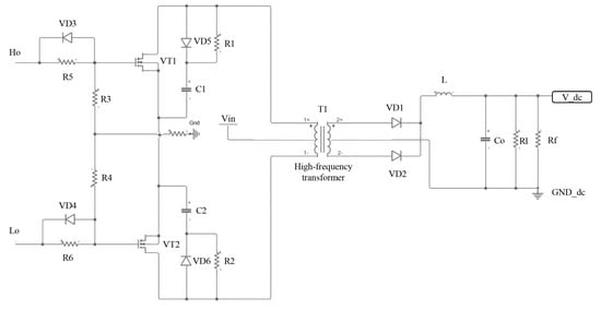 The push-pull DC converting transformer core has the features of a high utilization rate, a large output power and a small output ripple voltage, which can meet the requirements for the application in AC EDW. The schematic diagram of the push-pull DC converting circuit is shown in Figure 3. A switching power (48 V, 250 W) is used as an input power. VT1 and VT2 are two metal-oxide-semiconductor field-effect-transistor (MOSFET) power switches of the same type with the characteristics of IRF640N, which are switched in turn under the PWM signals high-side output (HO) drive signal and low-side output (LO) drive signal with a different phase of 180° and a duty ratio of less than 50%. Fast recovery diodes (FRD) with the characteristics of MUR1100E are selected to function with the rectified effect and freewheeling effect. The energy storage inductor L is 0.5 H and the filter capacitor Co is 18.8 μF, realizing the continuous inductor current and low output voltage ripple.