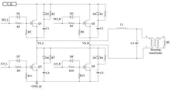 The inverter is used to convert the DC electric energy into AC electric energy, and a single-phase full-bridge is used as the topology of the inverter circuit, as shown in Figure 4. The MOSFETs of IRF840 with low on-resistance and fast on-off response are selected as the power switching tubes. An inductance of 100 mH and two parallel polypropylene capacitors of 10 nF are used to make up the inductance-capacitance (LC) low-pass filter to filter out the high frequency harmonics. SPWM signals HO_L and HO_R with dead time are complementary in phase. The alternating switching of the power switching tubes is controlled by the SPWM signal, and the straight-through phenomenon is eliminated due to the presence of the dead time. Then, the sinusoidal AC voltage can be obtained through the low-pass LC filtering.