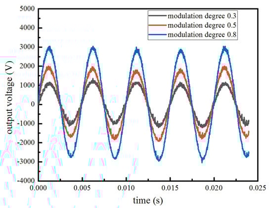 A controllable sinusoidal high-voltage AC voltage can be obtained successfully by transforming the input voltage through the inverter circuit, the boost circuit and the control circuit. The influence of modulation degree on the sinusoidal alternating voltage is shown in Figure 5. The sinusoidal output voltage increases with the increase in modulation degree at a certain proportion.