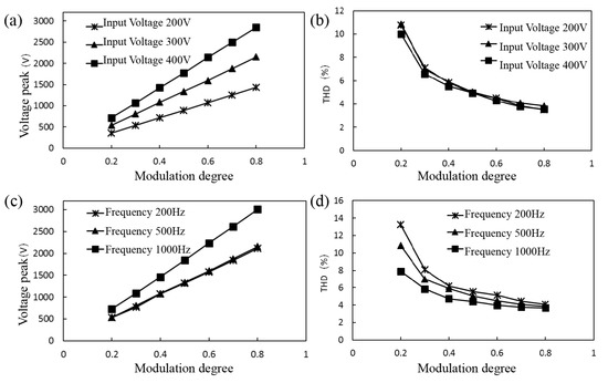 The peak of sinusoidal output voltage and total harmonic distortion (THD) vary with modulation degree. (a,b) Frequency 500 Hz, load 50 MΩ; (c,d) Input voltage 300 V, load 50 MΩ.