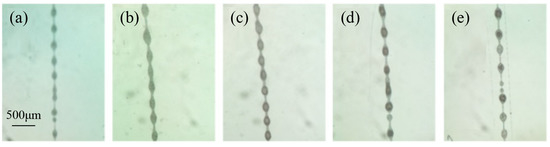 Direct-write micro-droplets on a silicon substrate under different voltage amplitudes: (a) 1523; (b) 1583; (c) 1647; (d) 1719; and (e) 1792 V. Voltage frequency, solution supply rate, nozzle inner diameter, distance between the nozzle and collector, and platform moving speed are 200 Hz, 60 μL/h, 60 μm, 3 mm, and 50 mm/s, respectively.
