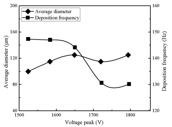 The effects of average droplet diameter and deposition frequency by voltage amplitude. Voltage frequency, solution supply rate, nozzle inner diameter, distance between nozzle and collector, and platform moving speed are 200 Hz, 60 μL/h, 60 μm, 3 mm, and 50 mm/s, respectively.