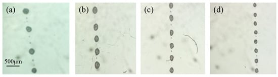 Direct-write micro-droplets on a silicon substrate under different voltage frequency: (a) 200; (b) 300; (c) 400; and (d) 500 Hz. Voltage amplitude, solution supply rate, nozzle inner diameter, distance between nozzle and collector, and platform moving speed are 1807 V, 60 μL/h, 60 μm, 3 mm, and 50 mm/s, respectively.