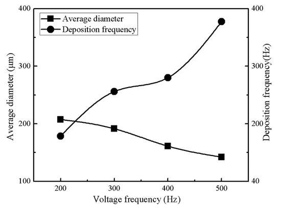 The effects of average droplet diameter and deposition frequency by voltage frequency. Voltage amplitude, solution supply rate, nozzle inner diameter, distance between the nozzle and collector, and platform moving speed are 1807 V, 60 μL/h, 60 μm, 3 mm, and 50 mm/s, respectively.