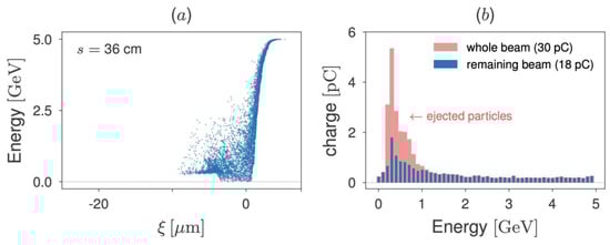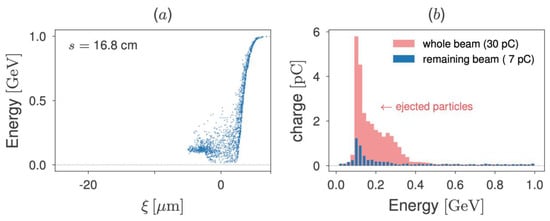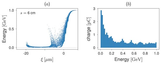 Simulation results show that the particles in the bunch lose their energies quickly. After propagating approximately 6 cm in the plasma, the particles at the tail of the bunch lose most of their energies. This corresponds to an average decelerating gradient of approximately 16.7 GeV/m. The decelerated particles suffer phase slippage towards the next accelerating phase of the longitudinal wakefield. As a result, the bunch length increases during energy dumping. If the bunch propagates further in the plasma, the decelerated particles will reach an accelerating phase of the wakefield, gaining energy from it. This energy gain at the tail of the bunch compensates the energy loss from other bunch regions, saturating the net beam energy extraction. The distance at which this saturation starts (6 cm, in our case) is defined as the saturation distance. Figure 1 shows the beam longitudinal phase space after propagating 6 cm in plasma, in panel (a), and the beam energy spectrum, in panel (b). It can be seen in panel (a) that, while the beam energy at the head of the bunch () does not change, the particles at the tail () start gaining energy. Figure 1a also shows a secondary spike of higher-energy particles, located within the region with energies ranging from zero to approximately 0.6 GeV. This is due to the fact that, in this region, the wakefield is rapidly decreasing towards zero, and hence providing weaker decelerating gradients compared to particles in other regions. Figure 1b also provides quantitative information regarding the beam charge and energy distribution, hence complementing the beam phase space shown in Figure 1a. From Figure 1b, it can be seen that a large fraction of beam particles is decelerated to low energies, while a certain amount remains distributed up to the initial beam energy.