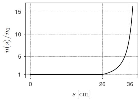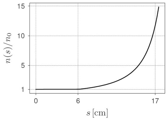 Figure 2 shows a typical plasma density profile, in which the density increases in a non-linear fashion from n0 = 9.9 × 1017 cm−3, at 6 cm, to 10 n0 = 9.9 × 1018 cm−3, at approximately 17 cm. This particular plasma density profile can be obtained by imposing a constant rate of change for the plasma wavelength with respect to the propagation distance s, i.e., [14].