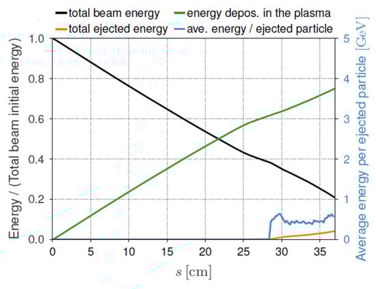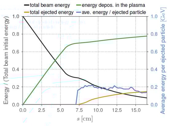 The beam energy loss as a function of the propagation distance in the plasma is shown in Figure 8. Clearly, it can be seen that, after a 37 cm propagation, the beam loses almost 80% of its initial energy—75% of the beam energy is deposited in the plasma, and 5% is carried out by the transversely ejected particles.