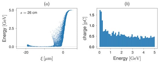 Figure 5, in panel (a), shows the 5 GeV beam longitudinal phase space after 26 cm propagation in plasma with a density of 9.9 × 1017 cm−3, i.e., the same value adopted in the previous case. In panel (b), the corresponding energy spectrum for this propagation distance is also shown. Qualitatively, the phase space of Figure 5a is equivalent to that shown in Figure 1a for the 1 GeV beam; particles at the middle and tail of the bunch lose their energies, and some particles at the tail already started picking up energy from the wakefield. However, since the beam energy is 5-fold higher in this case, the propagation distance to reach this point is 26 cm, which is approximately 4.3-fold longer with the 6 cm observed in Figure 1a. Figure 5b demonstrates that the 5 GeV beam also shows a large number of particles decelerated to small energies. As in the 1 GeV beam, a smaller fraction of beam particles (the fraction within the bunch head vicinities in panel a) maintain their initial energies.