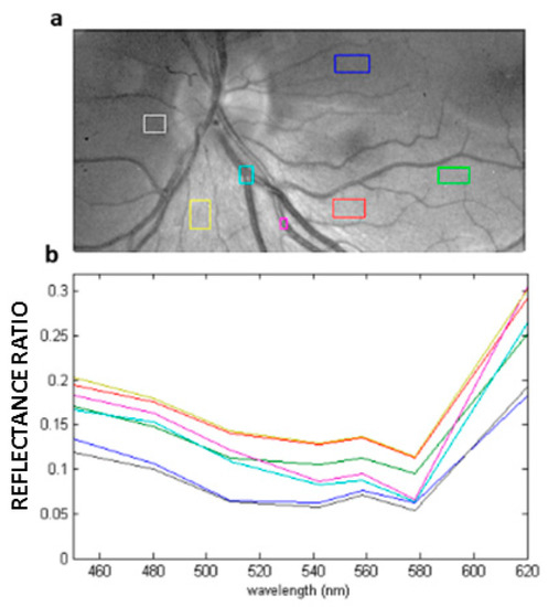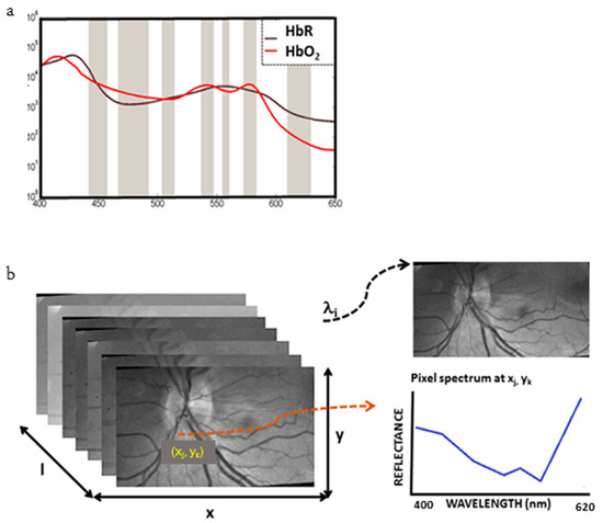 - Hirohara, Y.; Okawa, Y.; Mihashi, T.; Yamaguchi, T.; Nakazawa, N.; Tsuruga, Y.; Aoki, H.; Maeda, N.; Uchida, I.; Fujikado, T. Validity of retinal oxygen saturation analysis: Hyperspectral imaging in visible wavelength with fundus camera and liquid crystal wavelength tunable filter. Opt. Rev. 2007, 14, 151–158. [Google Scholar] [CrossRef]