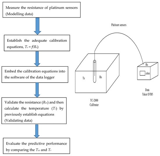 In the traditional method, the resistance of RTD elements was measured with Wheatstone bridge and then converted into voltage values [5]. These voltage values were transformed into digital values for further calculation, and linearization was the main problem for enhancing accuracy [9,10]. In this study, the resistance of PT-1000 was measured by using a data logger, and the measurement temperature could be calculated by the inverse calibration equation previously established by regression analysis. This calibration equation was software embedded in the data logger. This method provided a simple way to enhance the performance of RTD elements for temperature measurement.