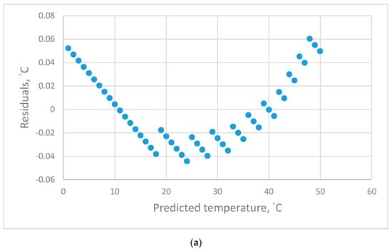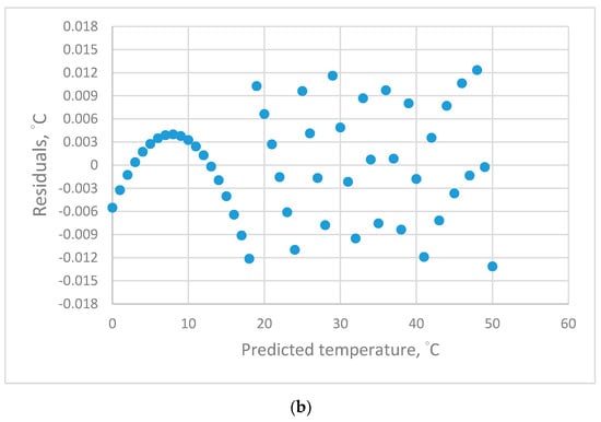 The temperature–resistance data of the platinum sensors in the range from 0 °C to 50 °C were measured to evaluate and validate the establishment of adequate calibration equations. The estimated values of the calibration equation parameters and statistics were established with regression analysis. The qualitative criterion was the residual plots. The qualitative criteria included the average of the absolute errors for accuracy and the standard deviation of the errors for precision.