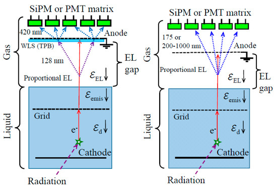 Ordinary EL in Ar and Xe results in two “standard” concepts of light signal amplification in two-phase detectors, depicted in Figure 1. In the first concept used in Ar, the EL gap is optically readout by the SiPM or PMT matrix indirectly, via a wavelength shifter (WLS), typically TPB. This is because the typical cryogenic PMTs and SiPMs are not sensitive to ordinary EL of Ar, at 128 nm.