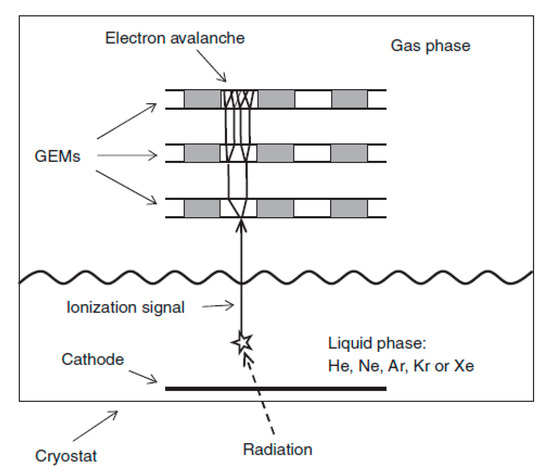 The original CRAD concept [35] is the following (see Figure 2): electron avalanching at cryogenic temperatures is performed in pure noble gases using GEM multiplier, either in a gaseous or two-phase mode. In the latter case the conventional two-phase electron-emission detector is provided with charge signal amplification using electron avalanching in the gas phase: the primary ionization electrons produced in the liquid are emitted into the gas phase by an electric field, where they are multiplied in saturated vapor using cascaded GEM multiplier. The proof of principle of this concept was demonstrated in 2003–2006 in two-phase Ar, Kr and Xe [35,40] at appropriate cryogenic temperatures (at around 87 K, 120 K and 165 K, respectively) and in gaseous He and Ne at lower temperatures, down to 2.6 K [41,42].