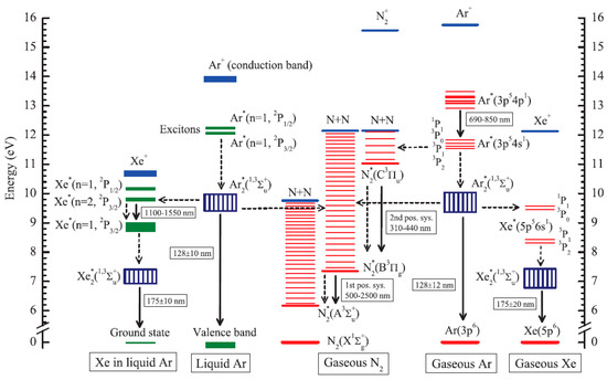 Energy levels of the lower excited and ionized states relevant to the ternary mixture of Ar doped with Xe and N2 in the two-phase mode [7]. These are shown for gaseous Ar, gaseous N2, gaseous Xe, liquid Ar and Xe in liquid Ar. The solid arrows indicate the radiative transitions observed in experiments and relevant to the present review (i.e., when the excitation is induced by ionization or electroluminescence). The numbers next to each arrow show the photon emission band of the transition, defined by major emission lines or by full width of the emission continuum. The dashed arrows indicate the most probable non-radiative transitions induced by atomic collisions for Ar, Xe and N2 species and their pair combinations in the gas and liquid phase.