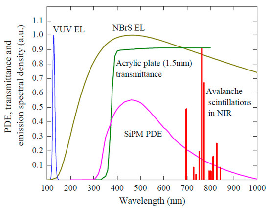 Photon emission spectra in gaseous Ar due to ordinary scintillations in the VUV measured in [8], NBrS EL at 8.3 Td theoretically calculated in [9] and avalanche scintillations in the near infrared (NIR) measured in [10,11]. Also shown are the photon detection efficiency (PDE) of SiPM (MPPC 13360-6050PE (Hamamatsu)) at overvoltage of 5.6 V and the transmittance of the acrylic plate (1.5 mm thick) [12].