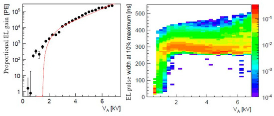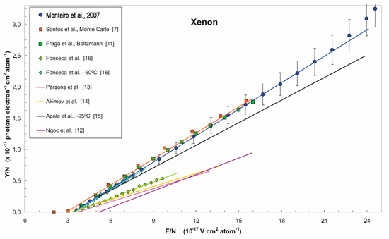 where reduced electric field E/N is given in Td (10−17 V cm2 atom−1). This equation is universally valid for all temperatures and gas densities. Parameter “b” defines the electric field threshold for proportional EL, while parameter “a” describes the light amplification factor, namely the number of photons emitted by drifting electron per applied voltage across the EL gap. For Ar, Kr and Xe this parameter was measured to be 81 [14], 120 [18] and 140 [17] photon/kV respectively.