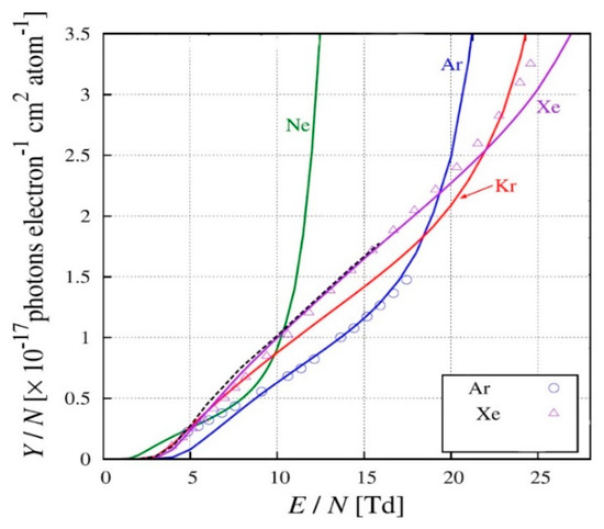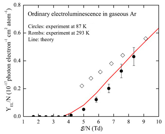 Atomic EL in the NIR has a line emission spectrum: see Figure 4. In addition, it has higher threshold in electric field than ordinary EL (see Figure 12). The absolute yield of atomic EL in the NIR was measured in [15,24]; it was well described by the theory using microscopic approach [23]: see Figure 12. It should be remarked that atomic emission in the NIR is particularly noticeable at even higher fields, above 30 Td, where the avalanche multiplication of the electrons takes place, accompanied by corresponding secondary scintillations: by so-called “avalanche scintillations” [11,25].