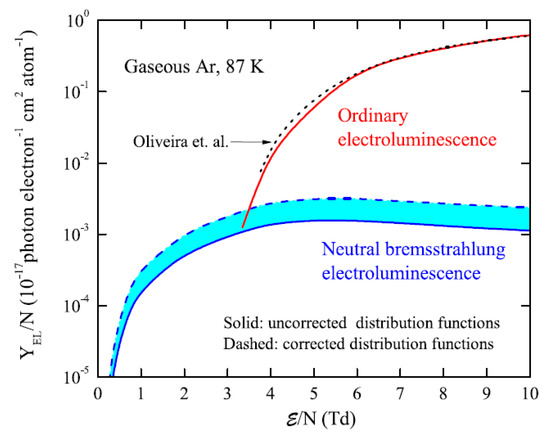 Consequently, the NBrS EL yield is predicted to be maximal for electron energies of the order of 10 eV where the elastic cross section has a maximum, thus corresponding to the electric fields of 4–5 Td. This is confirmed in Figure 9 showing the absolute yield of NBrS EL theoretically calculated in [9], in comparison with that of ordinary EL.