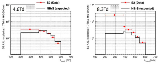 Near the threshold of ordinary EL, namely in the field range of 4–6 Td, it becomes important to take into account the possible contribution of NBrS EL, to correctly measure the EL yield of ordinary EL. Note that just in this field region, namely nominally at 4.6 Td, the DarkSide dark matter search experiment operates [22]. In [9,13] the NBrS contribution was measured, using dedicated spectral devices insensitive to the VUV, and appropriately subtracted from the data obtained with VUV-sensitive devices. The resulted EL yield of ordinary EL, shown in Figure 11, is in good agreement with the theory. On the other hand, the experimental data of [14] in Figure 11 have an excess over those of [9] and theory [16], below 6 Td. It would be logical to explain this discrepancy by considering the NBrS contribution, which was not taken into account in [14].