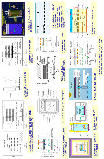 Later, the original CRAD concept was elaborated: it was suggested to provide CRADs with new features. There are more than a dozen different concepts with charge and light amplification in two-phase and liquid detectors developed by different groups since 2003: their gallery by 2012 is shown in Figure 13. For their detailed description, we refer to review [4] and appropriate references listed in the figure: [15,25,35,40,43,44,45,46,47,48,49,50,51,52,53,54]. The references to such concepts and their realization after 2012 are as follows: [24,55,56,57,58,59,60,61,62].