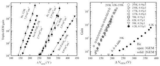 - Buzulutskov, A.; Dodd, J.; Galea, R.; Ju, Y.; Leltchouk, M.; Rehak, P.; Tcherniatine, V.; Willis, W.; Bondar, A.; Pavlyuchenko, D.; et al. GEM operation in helium and neon at low temperatures. Nucl. Instrum. Methods Phys. Res. Sect. A Accel. Spectrom. Detect. Assoc. Equip. 2005, 548, 487–498. [Google Scholar] [CrossRef][Green Version]