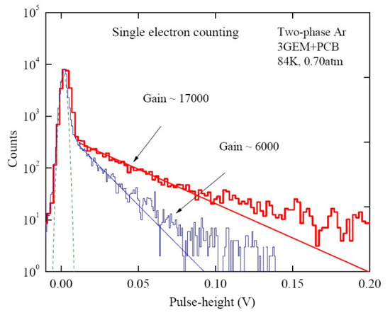 Pulse-height spectra in two-phase Ar detector with triple-GEM multiplier charge readout, operated in single electron counting mode with external trigger, at charge gains of 6000 and 17,000 [4,68]. The electronic noise spectrum (dashed line), corresponding to the equivalent noise charge of σ = 940 e−, is also shown. The multiplier active area was 2.8 × 2.8 cm2. The results were obtained for specially selected GEM foils resistant to discharges, to reach the highest gain. Note that the stable maximum gain of typical triple-GEM multipliers in two-phase Ar was somewhat lower: of about 5000.