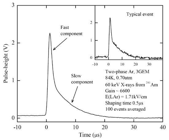 Typical anode signals in two-phase Ar detector with triple-GEM multiplier charge readout at emission electric field in the liquid of 1.7 kV/cm [4,69]. The fast and slow components of electron emission through liquid-gas interface are distinctly seen.