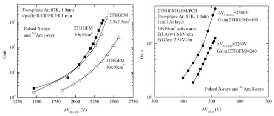 Left: gain characteristic of double-THGEM multipliers in a two-phase Ar detector for a THGEM active area of 10 × 10 cm2 (maximum gain was limited by discharges) compared to that of 2.5 × 2.5 cm2 (maximum gain was not reached) [72]; a comparison to that of a single-THGEM multiplier (maximum gain was limited by discharges) is also shown. Right: gain characteristics of hybrid 3-stage 2THGEM/GEM multiplier in two-phase Ar detector for active area of 10 × 10 cm2 [4,72]. Shown is the overall multiplier gain as a function of the voltage across GEM, at two fixed voltages across each THGEM, i.e., at two values of 2THGEM gain indicated in the figure. Here the maximum gains were limited by discharges.