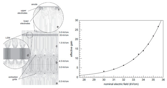 - Cantini, C.; Epprecht, L.; Gendotti, A.; Horikawa, S.; Periale, L.; Murphy, S.; Natterer, G.; Regenfus, C.; Resnati, F.; Sergiampietri, F.; et al. Performance study of the effective gain of the double phase liquid Argon LEM Time Projection Chamber. J. Instrum. 2015, 10, P03017. [Google Scholar] [CrossRef][Green Version]