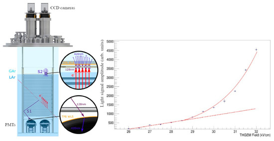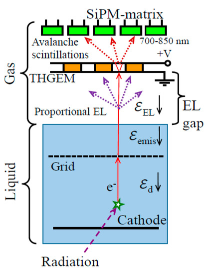 - Bondar, A.; Buzulutskov, A.; Grebenuk, A.; Sokolov, A.; Akimov, D.; Alexandrov, I.; Breskin, A. Direct observation of avalanche scintillations in a THGEM-based two-phase Ar avalanche detector using Geiger-mode APD. J. Instrum. 2010, 5, P08002. [Google Scholar] [CrossRef]