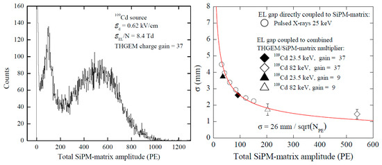 The successful performance of two-phase Ar detectors with triple-GEM charge readout is illustrated in Figure 16 and Figure 17. In particular, the high triple-GEM gain provided the operation of the two-phase detector in single-electron counting mode (Figure 16) [68]. It should be remarked that though the single-electron spectra are well separated from electronic noise at gains exceeding 5000, they are described by an exponential function (rather than by a peaked function). The latter is generally a rule for gaseous multipliers operated in proportional mode, due to intrinsically considerable fluctuations of the avalanche size. Consequently, the single- and double-electron events can hardly be distinguished in two-phase Ar detectors with GEM (or THGEM) charge readout. For that, the combination with PMT- or SiPM-based optical readout should be used, as suggested in [15,24]. Accordingly, the function of GEM- or THGEM-based charge readout would be to provide superior spatial resolution.