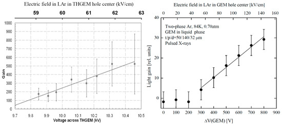 However for larger active area, of 10 × 10 cm2, the maximum gain in two-phase Ar detector decreased three-fold: down to about 1000 for double-THGEM multiplier [70] and 100–200 for single-THGEM multiplier [72,73]: see Figure 19 (left) and Figure 20 (right). This could result from the larger number of holes, implying a larger discharge probability on defects. Note that the nominal electric field in Figure 20, defined as the THGEM voltage divided by its dielectric thickness, is higher than the real electric field in the THGEM hole.
