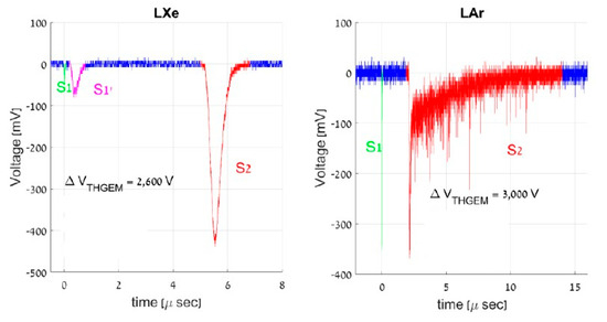 - Bondar, A.; Buzulutskov, A.; Grebenuk, A.; Pavlyuchenko, D.; Tikhonov, Y.; Breskin, A. Thick GEM versus thin GEM in two-phase argon avalanche detectors. J. Instrum. 2008, 3, P07001. [Google Scholar] [CrossRef]