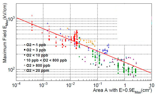 - Tvrznikova, L.; Bernard, E.; Kravitz, S.; O’Sullivan, K.; Richardson, G.; Riffard, Q.; Waldron, W.; Watson, J.; McKinsey, D. Direct comparison of high voltage breakdown measurements in liquid argon and liquid xenon. J. Instrum. 2019, 14, P12018. [Google Scholar] [CrossRef]