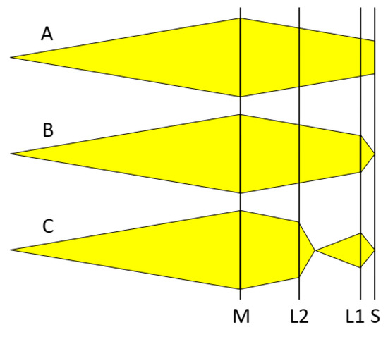 Figure 1. Operating modes A, B, and C, shown in the horizontal plane. M is a diamond monochromator crystal with Laue focusing, S is the sample position. L1 is the primary focusing lens. L2 is the secondary focusing lens creating a virtual source point for L1 in configuration C.